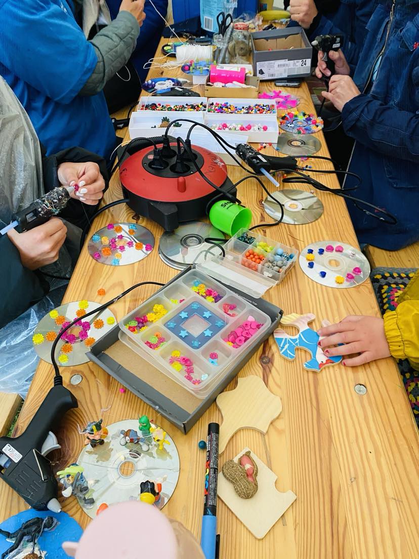Vi fylder vores to vogne med materialer, kører dem ud til jer, sætter det fint og flot op og står for en workshop (tema finder vi i fælleskab).
